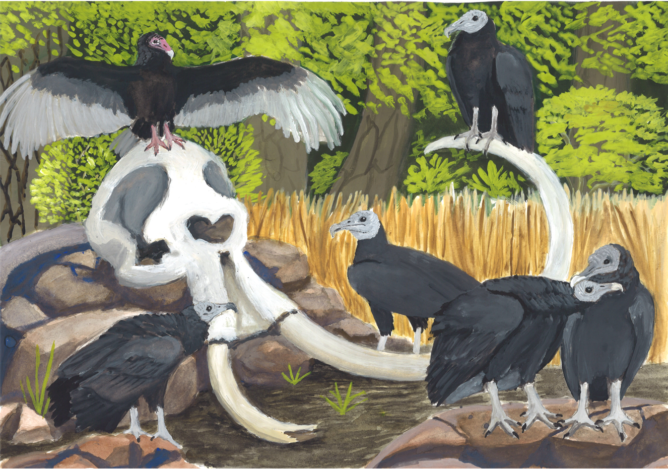 Fig 3. Somewhere in the US midwest, a turkey vulture and a flock of black vultures have gathered around the remains of a dead mammoth. There is no food left in the bones, but it's a good place to wait for more meals.