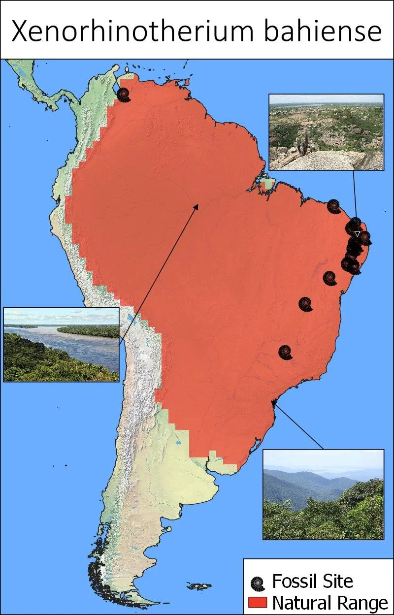 Xenorhinotherium bahiense is known primarily from the East Brazillian tip, as well as a few sites further to the South. A single site in Northern Venezuela has also yielded fossils, indicating an extensive range in the North of the continent (6). One modelling of the species range would also indicate that the Ecuadorian west slopes were highly suitable, and that both Colombia and parts of Peru would yield potentially good habitat. No fossil material is yet known from these locations but are also not especially well studied (6), however cave paintings from southern Colombia may portray Xenorhinotherium (10).